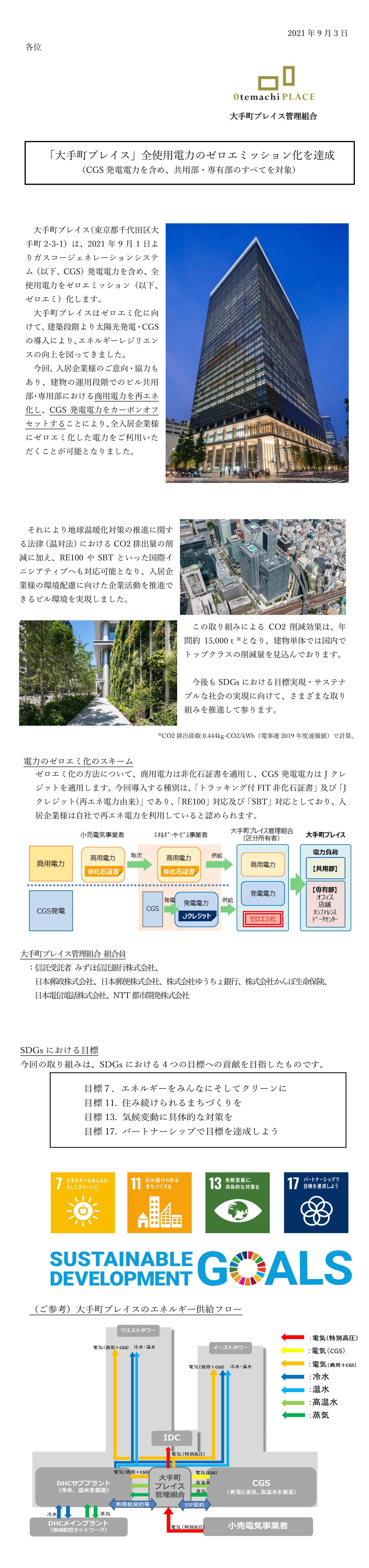 「大手町プレイス」全使用電力のゼロエミッション化を達成