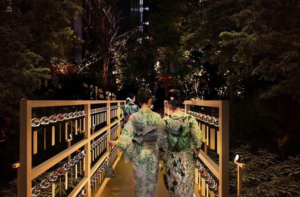 古くから近隣住民や徳川歴代将軍からも信仰を集め、商売繁盛や勝負事、宝くじ当選祈願などのご利益がある福徳神社。その神社と一体になっている福徳の森は、約1,000㎡の広さを持ち、四季折々の植物に囲まれた都会の癒しスポットです。期間限定で、福徳神社から福徳の森へと続く小径に、約200個の江戸風鈴を飾り「森の風鈴小径」に。昼間は風鈴の音、夜間はライトに照らされた風鈴で幻想的な空間で日本らしい夏を楽しめます。