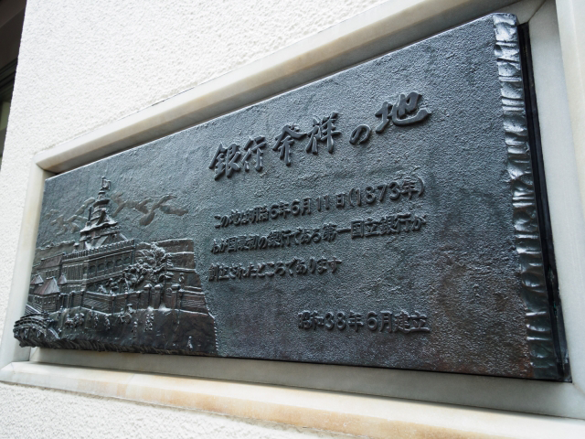 みずほ銀行兜町支店のビル壁面に掲げられている「銀行発祥の地」の銘板。