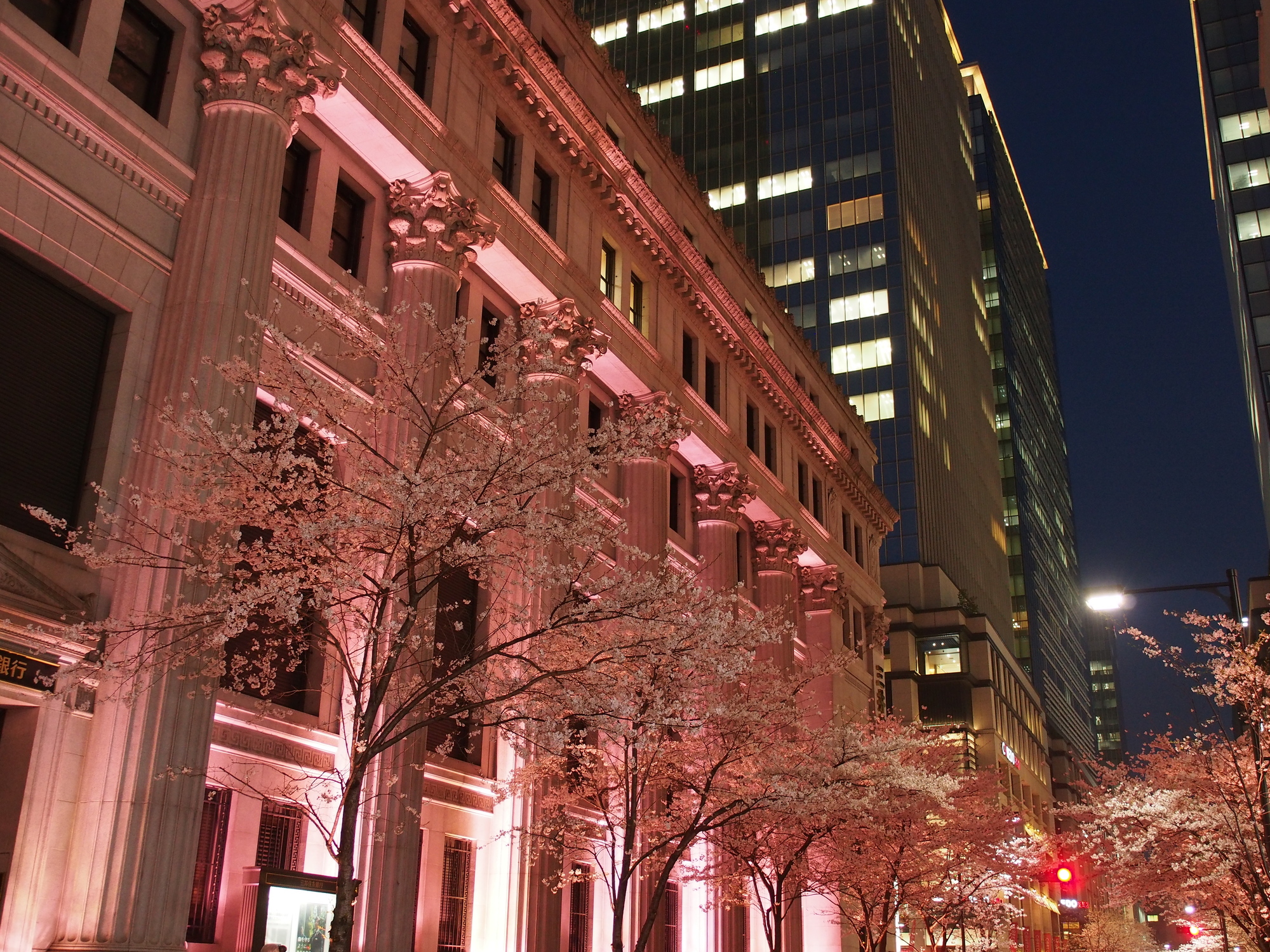 期間中は重要文化財である三井本館も桜色にライトアップされる。